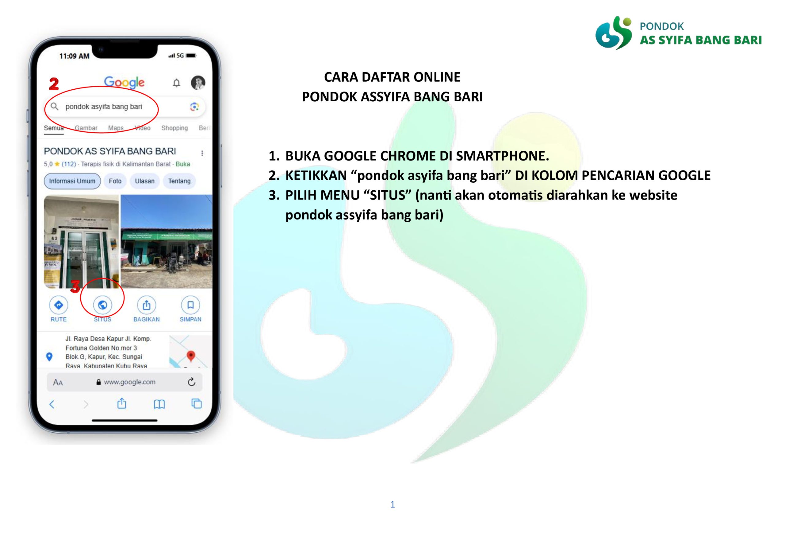Pasien cukup hanya menggunakan ponsel untuk mendaftar, silahkan diikuti cara daftar online di Pondok Assyifa Bang Bari sebagai berikut: